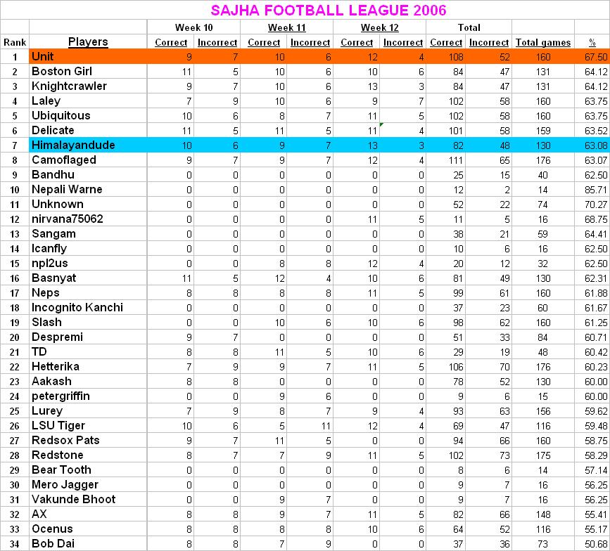 My apology to Redsox Pats. Sorry brother for missing your score. Remind me next week. i'll give u a bonus point. :P:P (sssshhhhhh) :D:D Ok here's the corrected score. Unit is the overall winner. Redsox Pats, and Himalayan Dude are the winners for week 12.