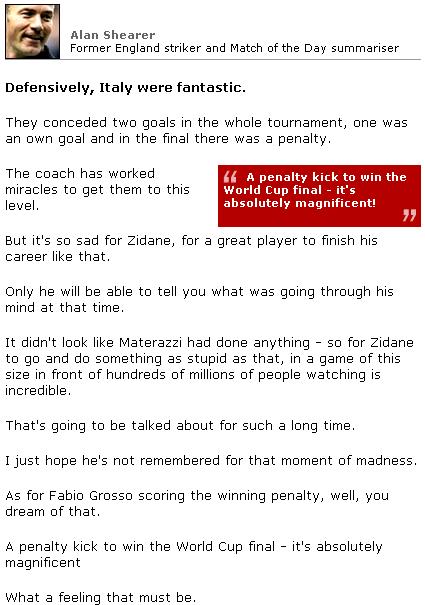 An interesting read : World-Zidane's red card was just, butt broke rules? By Mitch Phillips BERLIN, July 9 (Reuters) - The most memorable moment of the World Cup final, Zinedine Zidane's butt to the chest of Italian defender Marco Materazzi, was rightly punished by a red card even though the officials did not appear to see it happen. The incident in the second period of extra time brought a premature end to the great midfielder's career and he can have no complaints about the justice of it. He might, however, have cause to question its legality as it is against FIFA rules for TV pictures to be used as a basis for a refereeing decision. Zidane had been an ever-increasing influence in the match, in which he opened the scoring with a penalty in the seventh minute and almost won with a wonderful header in the 104th only to be denied by Gianluigi Buffon. Then, after a French attack broke down early in the second period Zidane trotted back from the Italian area exchanging comments with Materazzi. Something the Italian said obviously hit a raw nerve as Zidane stopped, walked back towards him and landed a fierce butt on his chest. Materazzi collapsed, Zidane continued on his way and the game continued. It had not gone completely unseen, however as several Italian players, with Buffon the most vociferous, approached the nearest linesman demanding action. Replays were shown on the hundreds of televisions in the media seats, raising an audible gasp. As the mayhem continued on the pitch Argentine referee Horacio Elizondo consulted his linesmen and, so it was later discovered, the fourth and fifth officials, who have access to TV but may have seen the incident live. The result was the red card and Zidane, who was also sent off for stamping during the 1998 World Cup, walked away from football for ever. Both coaches confirmed that the decision had been taken by the off-pitch officials, both Spaniards, but each coach took a different view on what that meant. "It was not Materazzi who got the attention of the referee, it was the fourth and fifth officials who pointed out what happened," said Italy's Marcello Lippi. "The French spectators didn't know what happened, they'll know when they read the newspapers tomorrow." France's Raymond Domenech said: "The referee saw nothing, the assistant referee saw nothing and then we have the fourth official saying to the referee what happened. "We have video in football and then the fourth official tips off the referee." France striker Thierry Henry said: "If they want to use video evidence it's not for one incident, they should use it for everybody and they should look at Materazzi too." Nobody in the French camp was saying what passed between the two players but David Trezeguet said: "Zidane can leave here with his head held high. There is more than football in life." Materazzi refused to talk about the incident © Reuters 2006. All Rights Reserved.