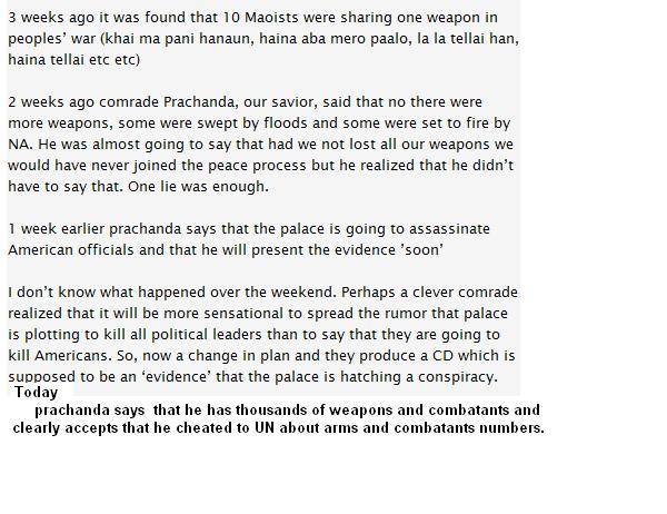These Thugs either be from SPAM or Maoist have nothing productive to do other than creating tension in the country and provoke masses so that they can simply use them for their personal benefits. Maoist and SPAM leaders have been engaged in propoganda since the beginning and have fuelling the tension just to hide their incompetency. They are the one who have not been to form an interim government, solve the Madeshi's issue, declare a date for CA election and have failed to make public Rayamaji commissio report. Any thing they speak is followed by a rhetoric saying that the details will be made public in next few days but non have come in last 9 months other than their compromise in increasing their power and curtailing KING's. It is hard to see any evidence if they have done any good to the country in last 9 months after they killed more than 15000 inncent Nepali life due to their struggle for power in last 15 years. If you have evidence of something why not make it public TODAY, why do you want to wait for few days. IS IT JUST TO SEE, HOW MANY MORE INNOCENT LIVES DIES ON STREE BECAUSE OF YOUR FALSE PROPOGANDA. I just wonder for how long will this drama continues till Nepali Junta understand the true motive of these Thugs and defy their propoganda.