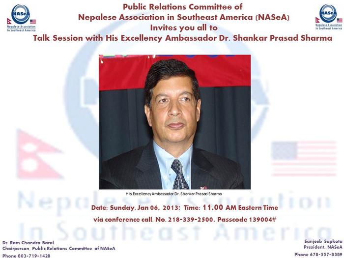 Please join NASeA Talk Session with His Excellency Nepalese Ambassador to the United States on Sunday, Jan 06, 2013 via Conference Call 218-339-2500; Passcode 139004#