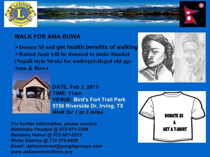 The goal of this program is to raise funds for our underprivileged Ama Buwa in Nepal who are suffering from cold winter by distributing them "sirakh" that would help them to survive. Dallas Everest Lions Club cares for our elderly parents who are not only suffering from crisis of old age but are also struggling to survive from the cold winter in Nepal. Walk for Ama Buwa has been organized by Dallas Everest Lions Club in Irving, Texas to be held on Feb 3, 2013at 11:00 AM in Bird's Fort Trail Park (Please disregard Campion Trail, Irving, TX which was confirmed in earlier email). Walk will be for 1 to 3 miles. Your participation makes a difference to save the life.